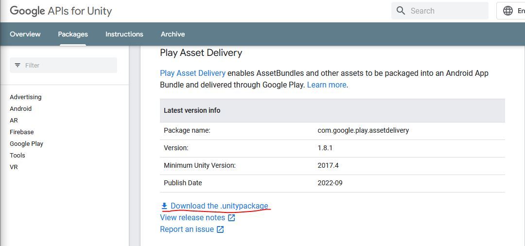 - Download the latest Play Asset Delivery package (used version 1.8.1 at the time of publication).