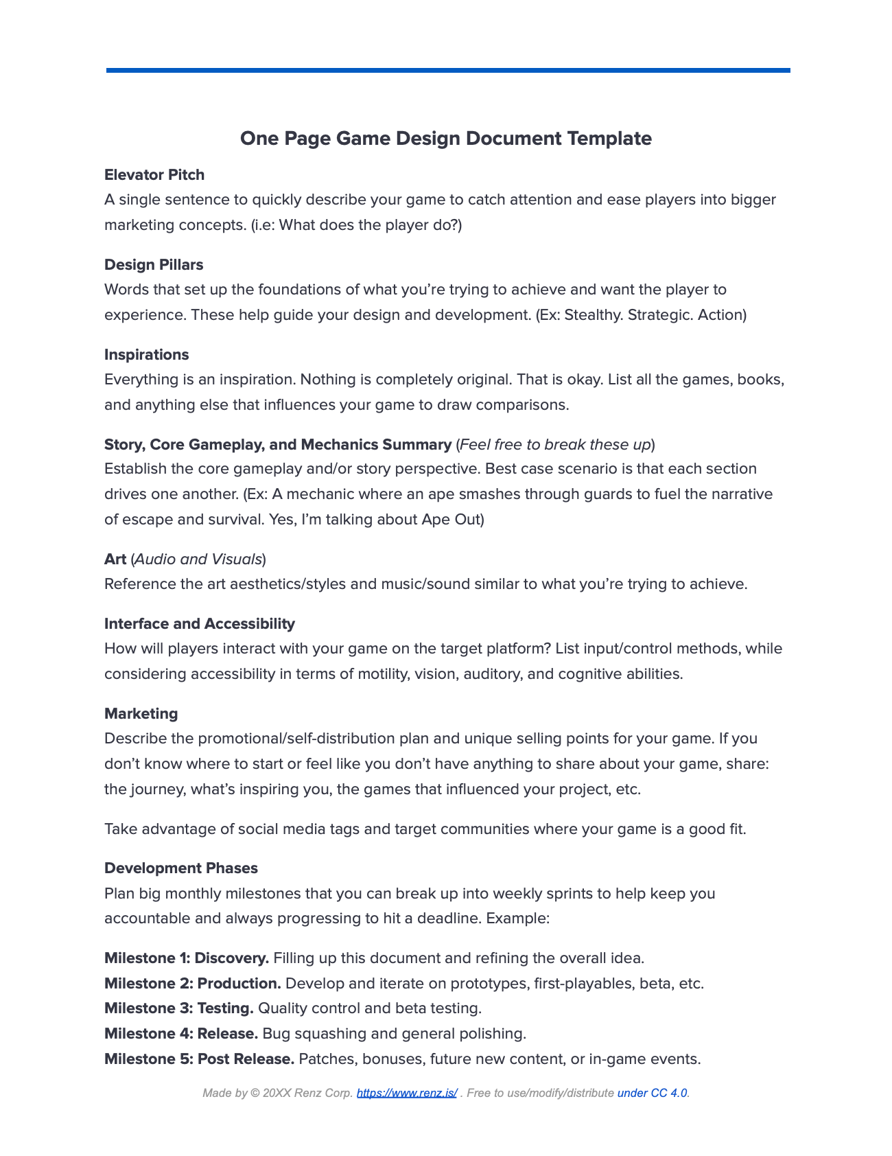 Here's the one page game design document in PDF format that you can download truly for free without giving up your email address or any of that.