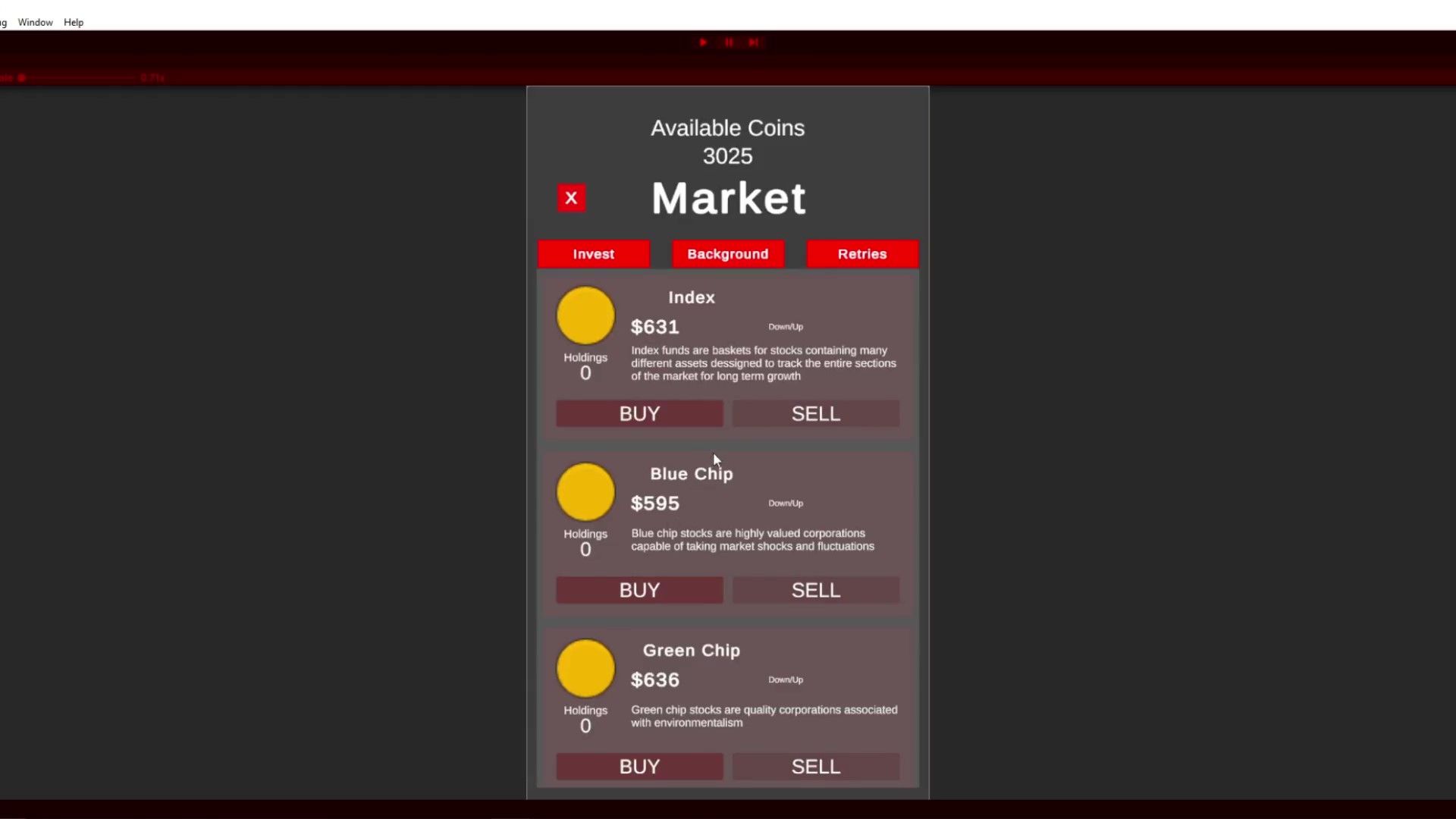 I've given each stock a base price of 600 and it will increase or decrease from there. Players will decide what's best for their money (score) with the investments they buy or sell. Also, for this to work, I needed to distinguish the difference between the players total coins versus their available coins for spending.
