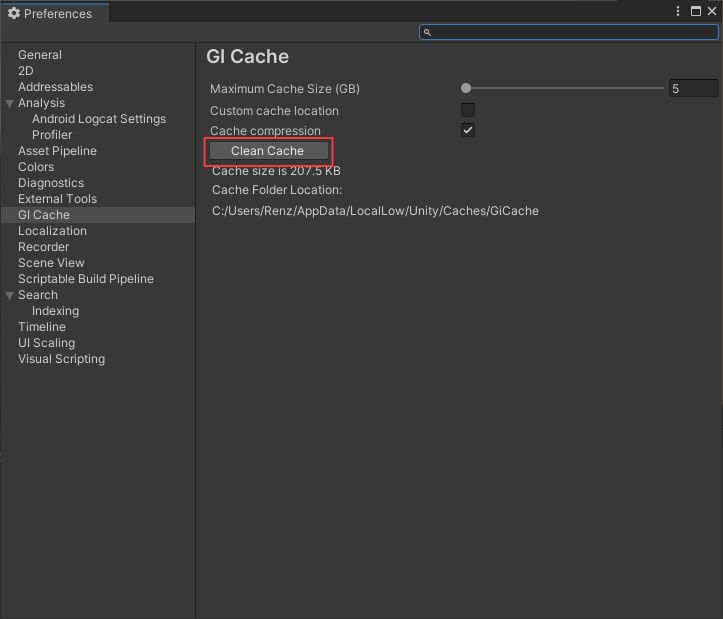 In the Unity Editor toolbar, go to Edit -> Preferences -> GI Cache -> Press the Clean Cache button